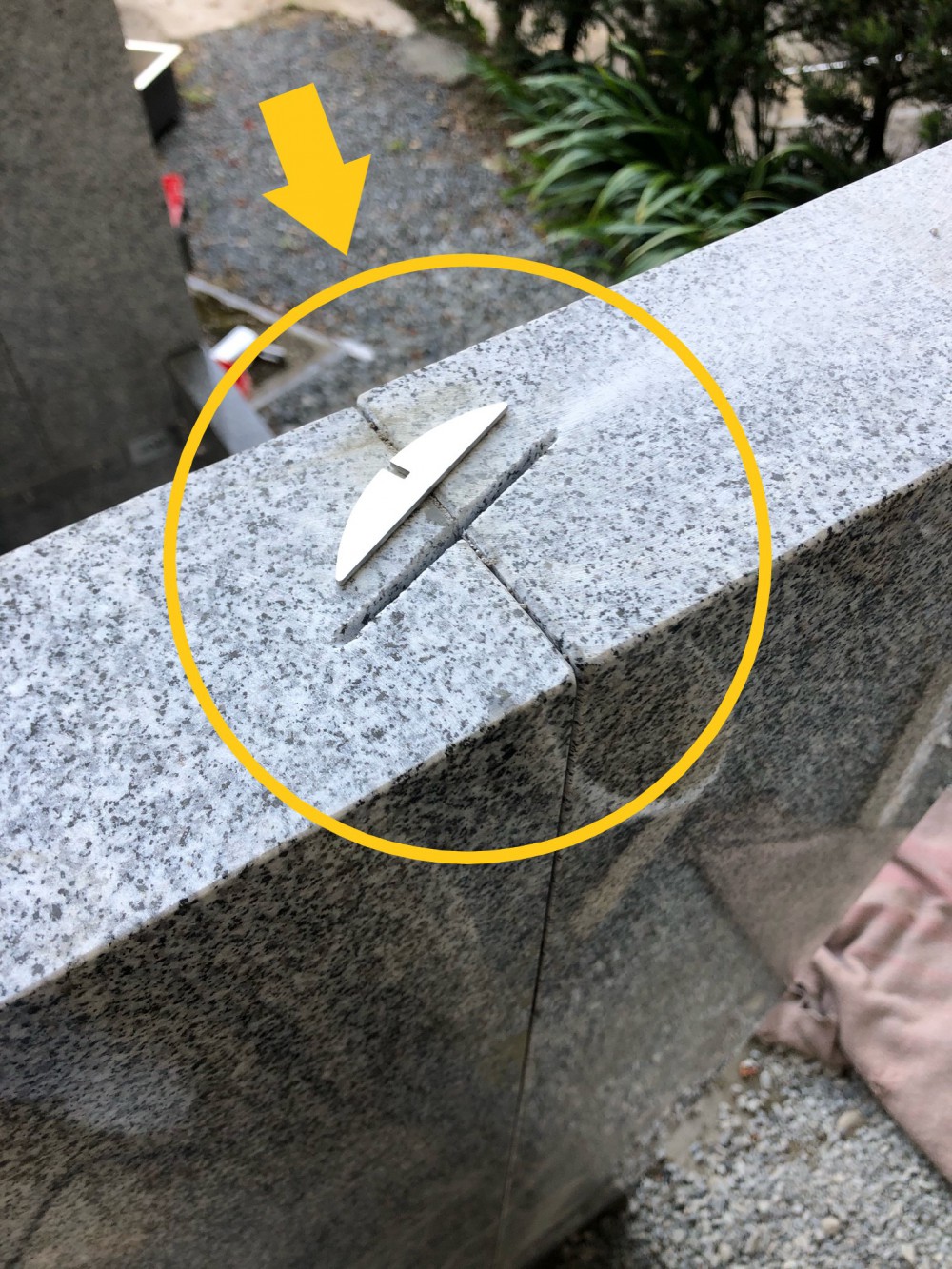 また、柱の上部の石と石の間に切込みを入れ、金具を入れて石材同士が離れないように補強します。